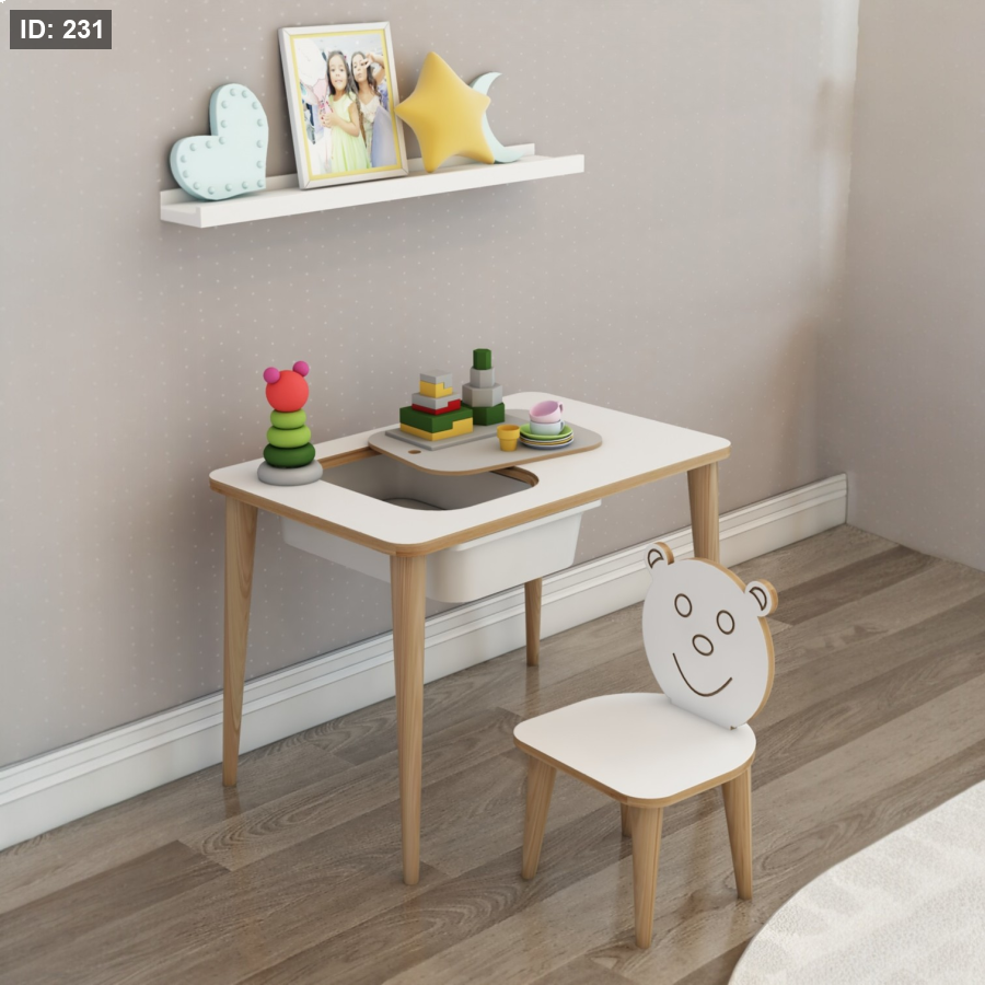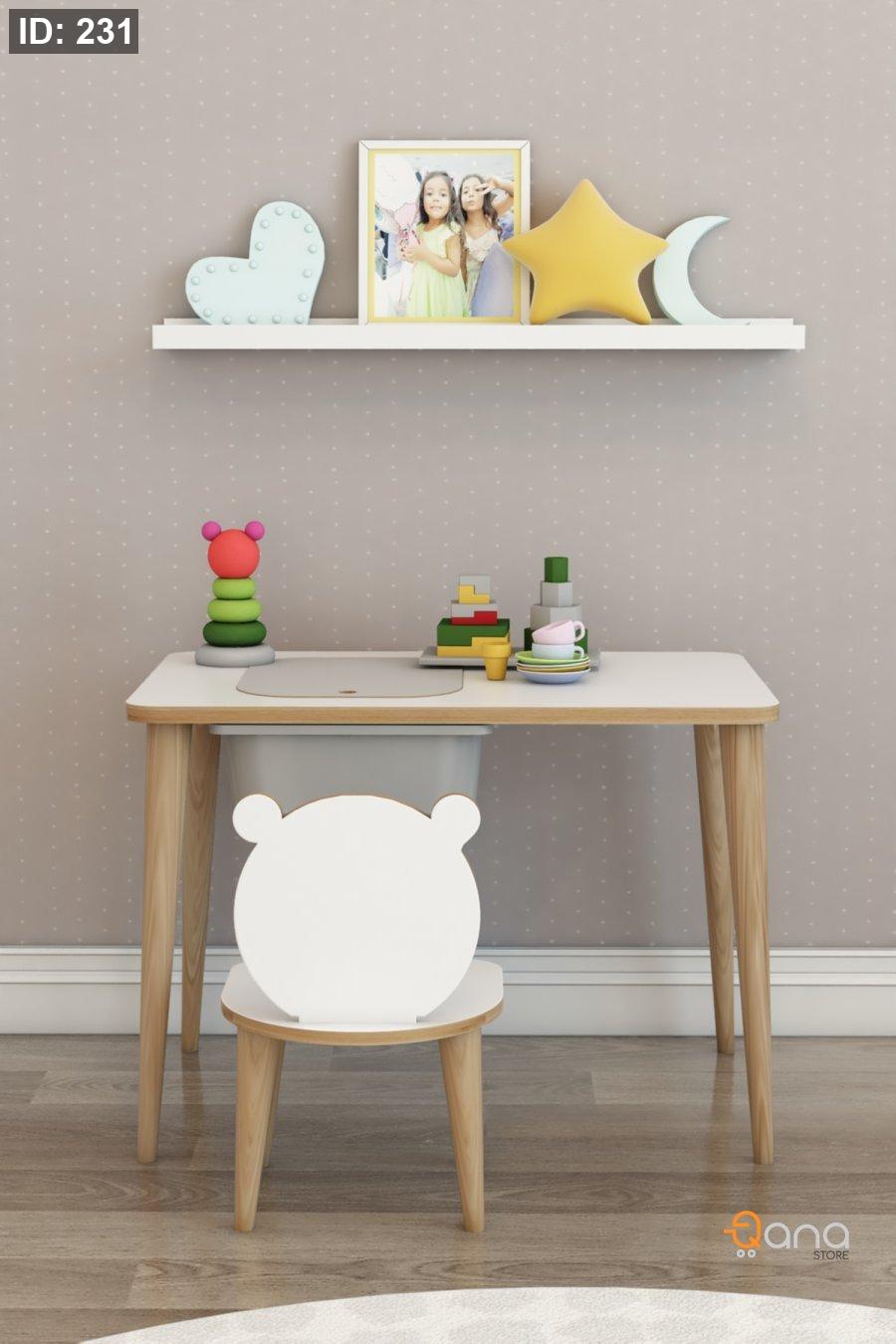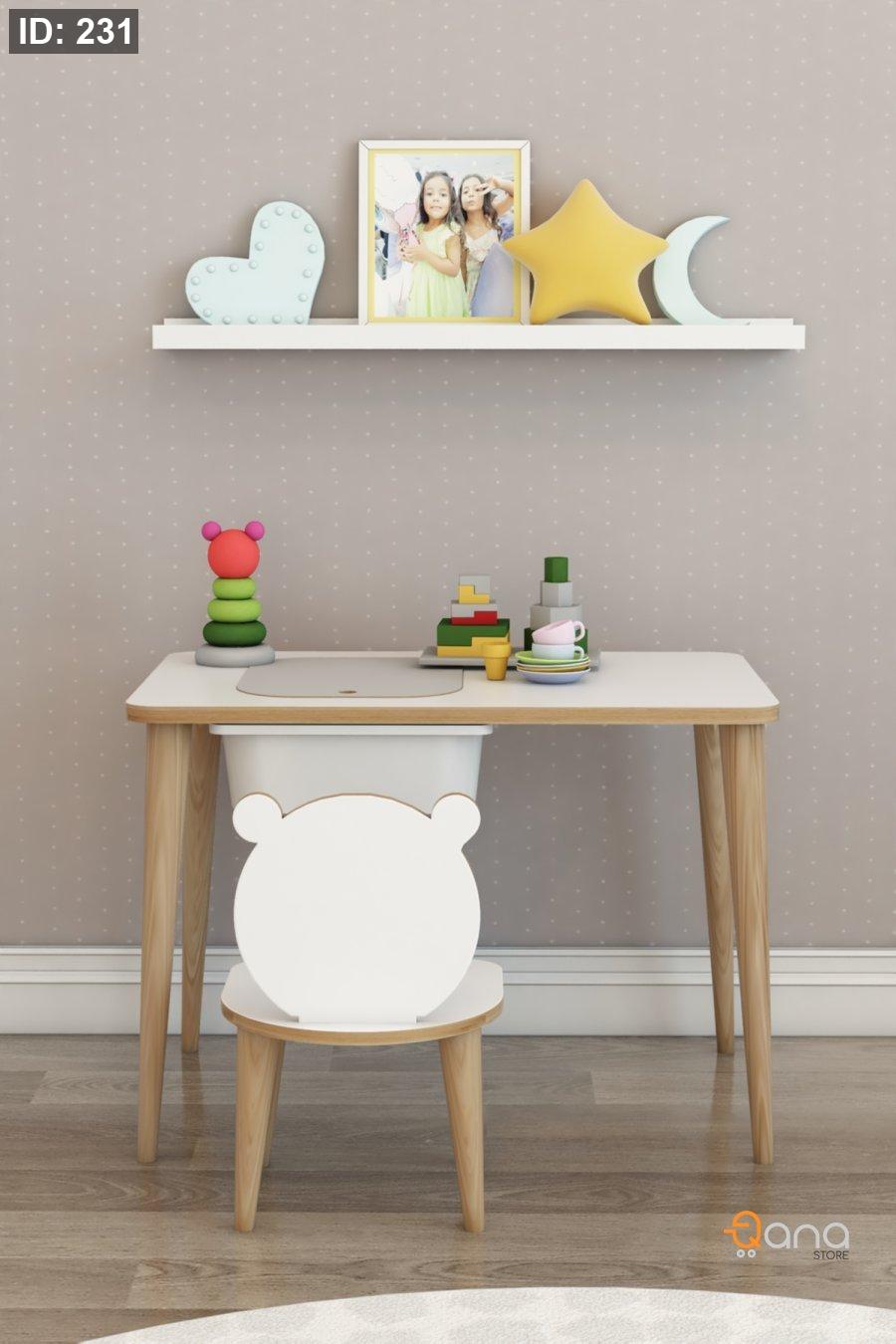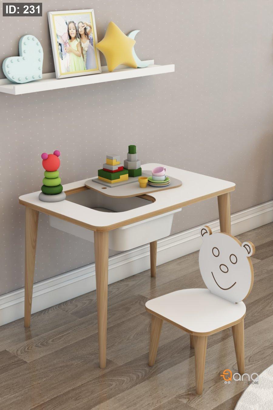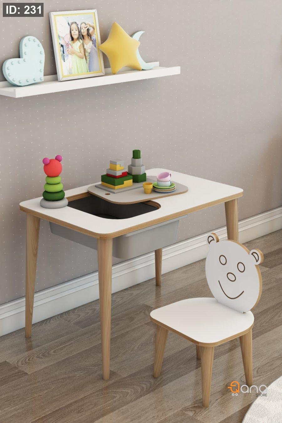 مكتب للأطفال للدراسة واللعب والأنشطة، طاولة للكتابة والمسح مع كراسي.